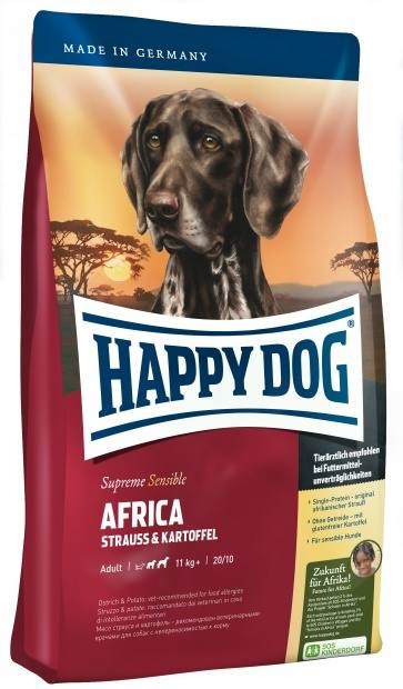 Happy Dog Supreme Sensible Africa 1 kg - táplálékérzékeny kutyák részére Africa - A Happy Dog Africa egy rendkívül ízletes, teljes értékű szuper prémium eledel, amely ideális valamennyi igényes ínyenc számára, akik a különlegeset keresik vagy nagyon válogatósak. Kiválóan alkalmas a közepes- és nagytestű fajtákhoz tartozó, érzékeny táplálkozású, speciális igényű kutyáknál is: a Happy Dog Africa ugyanis a strucchúst és a burgonyát egy sajátos keve- rékké egyesíti. A strucchús, amely egy igen ritka fehérjeforrás, ideális eledel a táplálék- intoleranciával küzdő kutyák számára. A burgonya nem tartalmaz glutént, ezért javasolható a ga- bonát rosszul tűrő állatok táplálására is. Az egészséges bőr- és a csillogó szőrzet szempontjából fontos omega-3 és omega-6 zsírsavak teszik teljessé a különleges receptet. A tápszemek mérete optimális a közepes- és nagytestű fajták fogazatához. Teljes értékű eledel minden 10 kg feletti,, normál energiaszükségletű, felnőtt kutya számára. Összetétel: burgonyapehely* (48%), strucchús fehérje* (18%), burgonyafehérje*, napraforgóolaj, melasz- szelet (cukormentesített)*, májhidrolizátum, almatörköly* (0,8%), repce, tengeri só, élesztő (kivonat)*. (* szá- rított) Analitikai összetevők: Nyersfehérje 20,0% Nyersolajok és zsírok 10,0 % Nyersrost 3,0% Nyershamu 7,5%, Kalcium 1,35% Foszfor 0,95% Nátrium 0,35% Omega-6 zsírsav 2,6% Omega-3 zsírsav 0,28% Adalékanyagok: Vitaminok / kg: A-vitamin (E672) 12000 I.E. D3-vitamin (E671) 1200 I.E. E-vitamin (all-rac-alfa-tokoferilacetát 3a700) 75 mg B1-vitamin (tiamin-mononitrát) 4 mg B2 vitamin (riboflavin) 6 mg B6-vitamin (piridoxin-hidroklorid 3a831) 4 mg D (+) biotin 575 mcg, kalcium-D-pantotenát 10 mg Niacin 40 mg B12 vitamin 70 mcg Kolin-klorid 60 mg Antioxidáns-anyagok, természetes eredetű, magas trokoferoltartalmú kivonatok. Nyomelemek / kg: Vas (E1, vas(II)szulfát monohidrát) 105 mg Réz (E4, réz(II)szulfát pentahidrát) 12 mg Cink (E6 cink-oxid) 125 mg Mangán (E 5, mangán(II)oxid) 25 mg Jód (E2, kalcium-jodát, vízmentes) 2 mg Szelén (E8, nátrium-szelénit) 0,15 mg Aminosavak/kg: DL Methionin 3200 mg