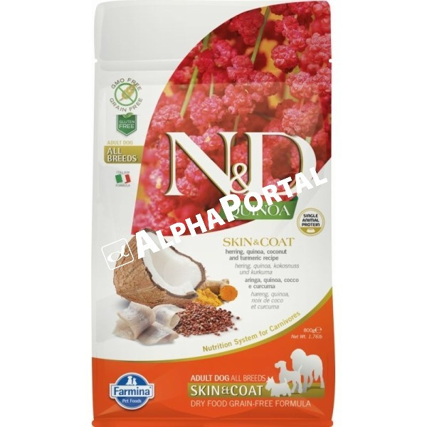 SKIN&COAT - Hering, quinoa, kókusz és kurkuma. Teljes értékű, gabonamentes eledel felnőtt kutyák részére. Az N&D Quinoa Skin&Coat egy teljes értékű diétás eledel kutyák számára, valamely összetevővel vagy tápanyaggal szembeni érzékenység csökkentésére. Használati utasítás: Adagolja az eledelt a táblázatban feltüntetett napi mennyiség szerint. A táblázatban feltüntetett napi mennyiség csupán tájékoztató jellegű, és a megfelelő testtömeg elérése érdekében módosíthatók. A napi mennyiség változhat a fajta, a környezet, a testmozgás, a temperamentum és a testfelépítés szerint. A napi adag két vagy több étkezésre osztható. Javasoljuk, hogy kezdetben az N&D-t keverje össze a korábban használt eledellel. Ajánlott időtartam: 3-8 hét, ha az érzékenység jelei megszűnnek, korlátozás nélkül alkalmazható. Biztosítson mindig friss, tiszta ivóvizet kedvence részére! Összetétel: vadon fogott friss hering (20%), dehidratált hering (20%), borsó keményítő, halolaj (heringből), quinoa mag (8%), lenmag, szárított kókusz (2.5%), kurkuma (2.5%), inulin, frukto-oligoszacharidok, élesztő kivonat (mannan-oligoszacharid forrás), kalcium-karbonát, dikalcium-foszfát, útifű, kálium-klorid, nátrium-klorid, sörélesztő, glükozamin, kondroitin-szulfát. Adalékanyagok/kg: Tápértékkel rendelkező adalékanyagok: A-vitamin 15000NE; D3-vitamin 1500NE; E-vitamin 600mg; C-vitamin 150mg; niacin 37.5mg; pantoténsav 15mg; B2-vitamin 7.5mg; B6-vitamin 6mg; B1-vitamin 4.5mg; H-vitamin 0.38mg; folsav 0.45mg; B12-vitamin 0.1mg; kolin-klorid 2500mg; béta-karotin 1.5mg; analóg metionin hidroxiláz cink-kelátja 910mg; analóg metionin hidroxiláz mangán kelátja 380mg; glicin-hidrát vas kelátja 250mg; analóg metionin hidroxiláz réz kelátja 88mg, szelénnel dúsított inaktivált élesztő 0.40mg; DL-metionin 4000mg; taurin 1000mg; L-karnitin 300mg. Érzékszervi adalékanyagok: aloe vera kivonat 1000mg; zöldtea kivonat 100mg; rozmaring kivonat. Antioxidánsok: tokoferolban gazdag természetes eredetű kivonatok. Analitikai összetevők: nyersfehérje 23.00%; nyers olajok és zsírok 12.00%; nyersrost 2.80%; nedvesség 9.00%; nyershamu 7.90%; kalcium 1.20%; foszfor 0.90%; Omega-3 zsírsavak 1.80%; Omega-6 zsírsavak 1.50%; DHA 0.70%; EPA 0.50%; glükozamin 1200mg/kg; kondroitin-szulfát 900mg/kg.