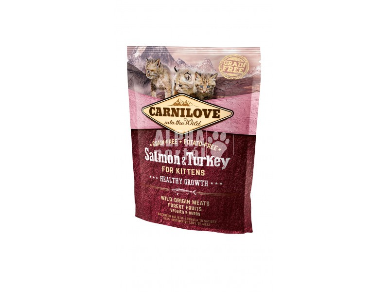 Carnilove Salmon & Turkey for Kittens - Healthy Growth GABONA- ÉS BURGONYAMENTES ELEDEL KÖLYÖK MACSKÁK RÉSZÉRE. Összetétel: lazac liszt (25%), pulyka liszt (24%), sárgaborsó (18%), csirke zsír (tokoferolokkal tartósítva, 11%), csirkefehérje hidrolizálva (9%), csirkemáj (3%), lazacolaj (3%), tápiókakeményítő (2%), alma (1%), sárgarépa (1%), lenmag (1%), csicseriborsó (1%), hidrolizált rákhéj (glükozamin forrás, 0,028%), porc kivonat (kondroitin forrás, 0,017%), sörélesztő (mannán-oligoszacharid forrás, 0,017%), cikóriagyökér (frukto-oligoszacharidok, 0,014%), yucca schidigera (0,01%), algák (0,01%), útifű (0,01%), kakukkfű (0,01%), rozmaring (0,01%), oregánó (0,01%), vörös áfonya (0,0008%), áfonya (0,0008%), málna (0,0008%). Analitikai összetevők: nyersfehérje 40.0 %, zsír 20.0 %, nyersrost 2.0 %, nyershamu 7.5 %, nedvesség 10.0 %, kalcium 1.3 %, foszfor 1.0 %, nátrium 0.5 %, magnézium 0.08 % Tápértékkel rendelkező adalékanyagok/kg: A-vitamin (E672) 25,000 NE, D3-vitamin (E671) 1,000 NE, E-vitamin (3a700) 750 NE, C-vitamin (E300) 350 mg, taurin 2,500 mg, kolin-klorid 2,300 mg, L-karnitin 70 mg, niacin 50 mg, biotin 2.0 mg, cink (E6) 160 mg, mangán (E5) 60 mg, vas (E1) 50 mg, réz (E4) 12 mg, jód (E2) 4.0 mg, szelén (E8) 0,25 mg, DL-metionin (3.1.1.) 15 mg, arginin (3c3.6.1) 13 mg, L-lizin (3.2.3.) 11 mg. Metabolizálható energia: 4 150 kcal/kg. Omega 3: 0,60 %, Omega 6: 2,70 % Etetési javaslat: Az eledelt szárazon, enyhén nedvesen vagy húsleveslével tálaljuk. Kölyök macskáknak az egész nap folyamán biztosítani kell az eledelt. Az eledel mennyisége a macska korától, aktivitásától függően változhat. Az etetési ajánlás az etetési táblázatban látható. Ha Carnilove-ot először fogyasztja macskája, akkor a korábbi eledellel keverje és fokozatosan növelje az új eledel arányát 7 nap alatt. Biztosítson mindig friss és tiszta ivóvizet kedvence részére.