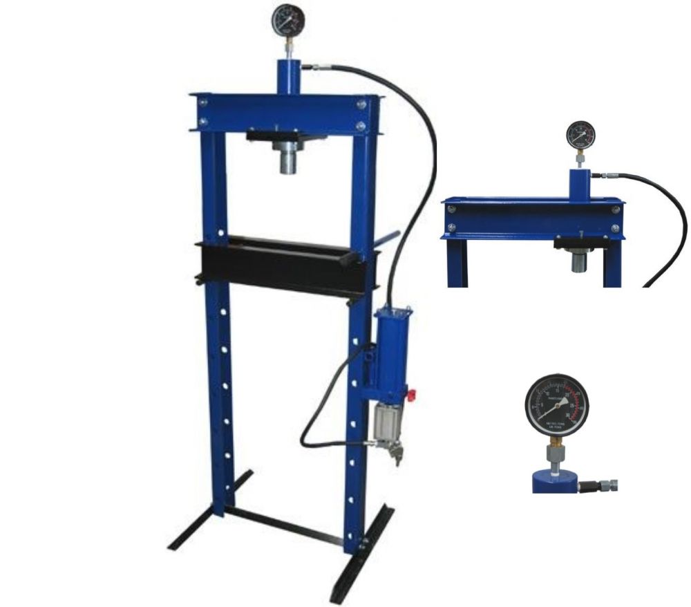 Pneumatikus-hidraulikus műhelyprés, nyomóerő 20t, löket 145mm, max. munkahossz 1035mm, munkaasztal méret kb. 500x200mm. Levegős rásegítéssel gyorsabban kinyomható a présgép dugattyúja a munkadarab felé. Ismertetés Nyomóerő 20 tonna Löket 145mm Max. lökethossz 1035mm Munkaasztal méret kb. 500x200mm Csomagolási méret 1595x210x115mm 650x225x250mm